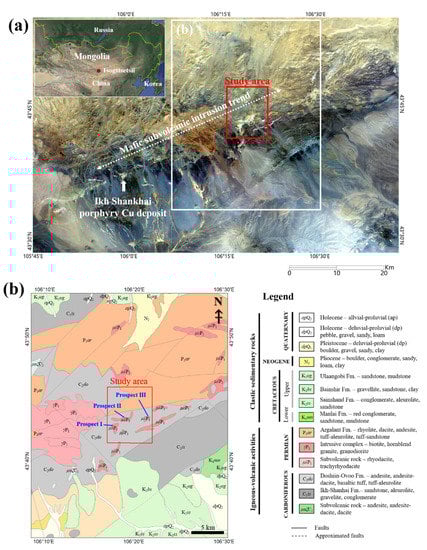 (a) Landsat Enhanced Thematic Mapper Plus image showing the location of Ikh sahnkhai porphyry Cu deposit and study area; and (b) geological map of the eastern Tsogttsetsii (modified from [34]). Inner map in (a) shows the location of Mongolia and Tsogttsetsii. The red lines define the study area corresponding to Figure 2.