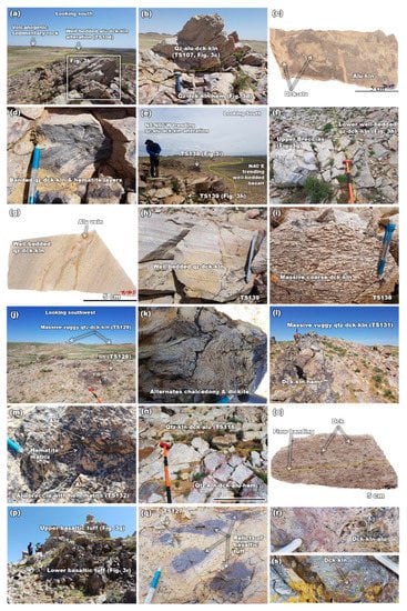 Photographs of rocks in the prospects of the study area. Prospect I: (a) quartz–alunite–dickite–kaolinite–hematite alteration of the southern part; (b) enlarged part of Figure 3a showing the upper part with quartz–alunite–dickite–kaolinite assemblages and the lower part with quartz–dickite–kaolinite-hematite assemblages; (c) a rock sample (TS117) showing alunite–kaolinite and dickite–alunite breccia and vuggy quartz in the upper part of Figure 3b; (d) banded quartz–dickite–kaolinite and hematite layers in the lower part of Figure 3b; (e) the northern alteration zone in the N40°W direction, unlike the southern alteration zone in the NS direction; (f) the northernmost part of the northern alteration zone, where breccia and well-bedded quartz–dickite–kaolinite alteration border; (g) a rock sample (TS140) from the upper part of Figure 3f showing an alunite vein that cuts the well-bedded quartz–dickite–kaolinite; (h) a rock sample (TS139) from the lower well-bedded quartz–dickite–kaolinite alteration of Figure 3f; and (i) a rock sample (TS138) collected from a massive coarse dickite–kaolinite layer, approximately 1 m thick, located in the middle of the alteration zone. Prospect II: (j) remnant volcanic rocks and eastern hydrothermal alteration zones; (k) alternation of chalcedony quartz and dickite; (l) massive vuggy quartz–dickite–kaolinite and dickite–kaolinite–hematite alterations in the center of the hydrothermal alteration zone; and (m) alunite breccia with hematite matrix found in the easternmost part. Prospect III: (n) connecting part of the quartz–kaolinite–dickite–alunite alteration and the quartz–kaolinite–dickite–alunite–hematite alteration zone; (o) a rock sample (TS121) showing elliptical dickite patches and flow textures; (p) remnants of basaltic volcanic rocks in the northeast; (q) filled dickite–kaolinite–alunite within relatively large gas cavities; (r) filled dickite–kaolinite within fine gas cavities; (s) remnants and relicts of basaltic tuff.