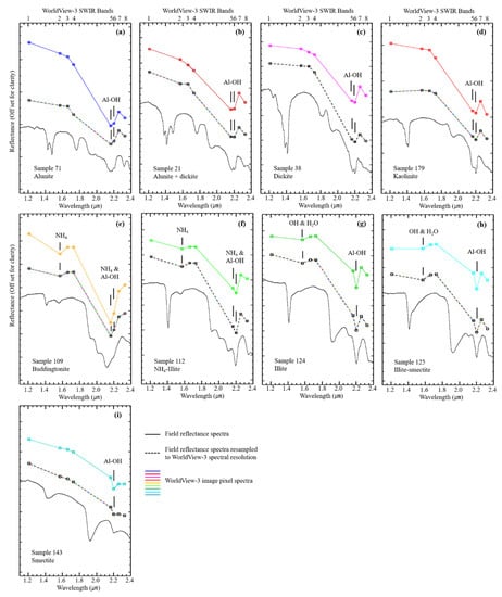 Comparison of field reflectance spectra of representative minerals in the study area resampled to the spectral resolution of WV-3 SWIR (black dashed lines), with WV-3 SWIR pixel spectra (solid lines with color) at the same locations. Square symbols show WV-3 SWIR band centers. Black vertical solid lines indicate wavelength positions of absorption features for NH4, OH, H2O, and Al-OH. Locations of field spectra are shown in Figure 2 with sample numbers. Note that a satellite pixel was assumed to be a spectrally predominant class.