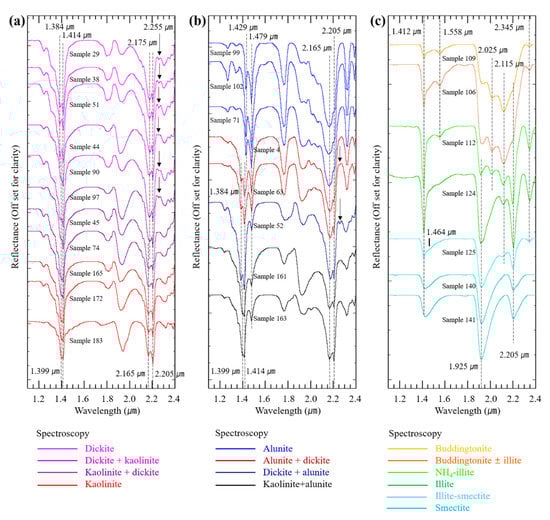 Representative reflectance spectra of samples collected from the acid alteration rock surface of the prospects. (a) Spectra of kaolin group minerals; (b) spectra of alunite and alunite + kaolin group minerals; (c) spectra of illite/smectite and ammonium minerals.