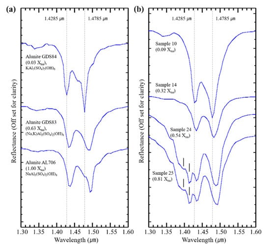 Reflectance spectra of alunite showing the OH overtone doublet absorptions shift at 1.429 and 1.479 µm with K and Na components. XNa is the mole fraction of Na in the alunite. As the Na content increases, the OH overtone doublet absorption in the spectrum of K-alunite shifts to longer wavelengths. (a) Representative United States Geological Survey (USGS) reflectance spectra of well-characterized alunite [35] and (b) field reflectance spectra for alunite collected from the rock surface of eastern Tsogttsetsii. XNa was calculated using the wavelength correlation method of [29]. The accuracy of this method using the absorption peak near 1.479 µm was ±0.05 XNa at a spectral resolution of 1 nm and ±0.1 XNa at a spectral resolution of 10 nm.