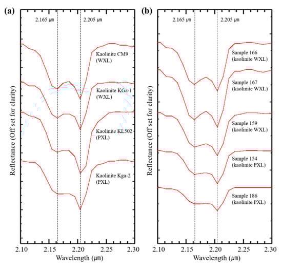(a) Representative USGS reflectance spectra of kaolinite showing shape variations of the OH doublet combination at 2.165 and 2.205 µm from well crystallized (WXL) kaolinite to poorly crystallized (PXL) kaolinite [35]; (b) kaolinite spectra collected from the rock surface of Prospect III, showing variation of crystalline.