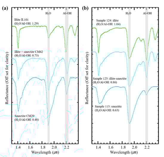 (a) Representative USGS reflectance spectra of illite, mixed-layered illite-smectite, and smectite with calculated H2O/Al-OH depth ratios [35]; (b) representative field reflectance spectra of illite, mixed-layered illite-smectite, and smectite with calculated H2O/Al-OH depth ratios.