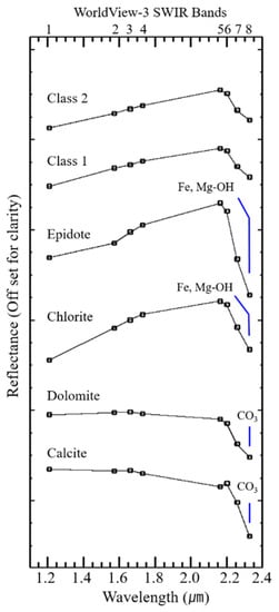 Comparison of WV-3 image spectra (class 1 and class 2) with USGS spectra (epidote, chlorite, dolomite, and calcite; [35]). WV-3 image spectra are the average for pixels from the SWIR band 6/SWIR band 8 BM image in Figure 7d. USGS spectra were resampled to WV-3 SWIR wavelength ranges.