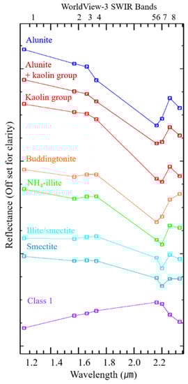 WV-3 SWIR endmember spectra for mixture-tuned-matched filter mineral mapping of the study area. Each endmember spectrum is an average of spectra from nine adjoining pixels from the same area as the known minerals identified by the field spectral measurements, DS, and band ratio images.