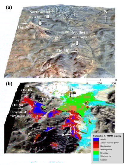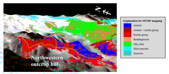 Prospect I: Alunite, kaolin group minerals, buddingtonite, NH4-illite, illite/smectite, and smectite were mapped at Prospect I (Figure 15). Alunite, surrounded by kaolin group minerals, was mapped in large outcrops in the southern and northwestern parts of Prospect I, matching the field survey (Figure 3a–i; TS113, TS140 in Figure 16b; Table A1). In particular, in the south of the northwestern outcrop hill, the alunite was mapped widely in the study area, and the alunite + kaolin group minerals predominates northward (Figure 16b). The 3D side view of the northwestern outcrop hill, overlaid on the DEM, shows that the alunite ± kaolin group in the upper part and the kaolin group in the lower part was laterally well developed (Figure 17). The lateral development of advanced argillic alteration was consistent with field observations (Figure 3a–i). The MTMF map shows an abrupt transition from kaolin group minerals to ammonium minerals, buddingtonite, and NH4-illite, at the north of the southern outcrop (black dashed line in Figure 16b). These ammonium minerals are widely distributed in the northeast. Illite/smectite and smectite was observed along the drainage from south to northeast in Prospect I (Figure 15 and Figure 16).