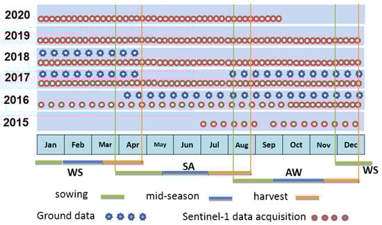 - Tian, H.; Wu, M.; Wang, L.; Niu, Z. Mapping Early, Middle and Late Rice Extent Using Sentinel-1A and Landsat-8 Data in the Poyang Lake Plain, China. Sensors 2018, 18, 185. [Google Scholar] [CrossRef] [PubMed]