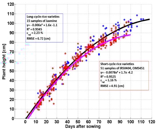 - About 60 days after sowing, a clear difference between long and short cycle rice at VH and VV backscatter can be observed (Figure 10a,b). For short cycle rice, VH and VV start increasing after 60 days while for long cycle rice, they continue to decrease until 75 days then start increasing again.