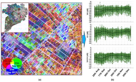 - Veloso, A.; Mermoz, S.; Bouvet, A.; Le Toan, T.; Planells, M.; Dejoux, J.-F.; Ceschia, E. Understanding the temporal behavior of crops using Sentinel-1 and Sentinel-2-like data for agricultural applications. Remote Sens. Environ. 2017, 199, 415–426. [Google Scholar] [CrossRef]