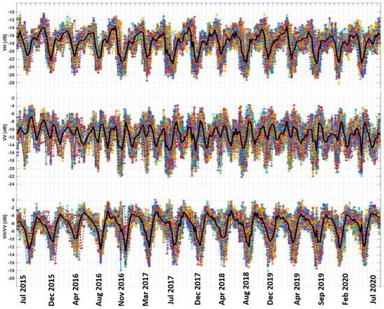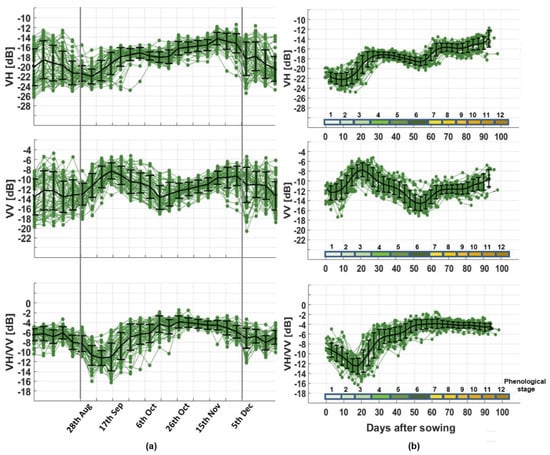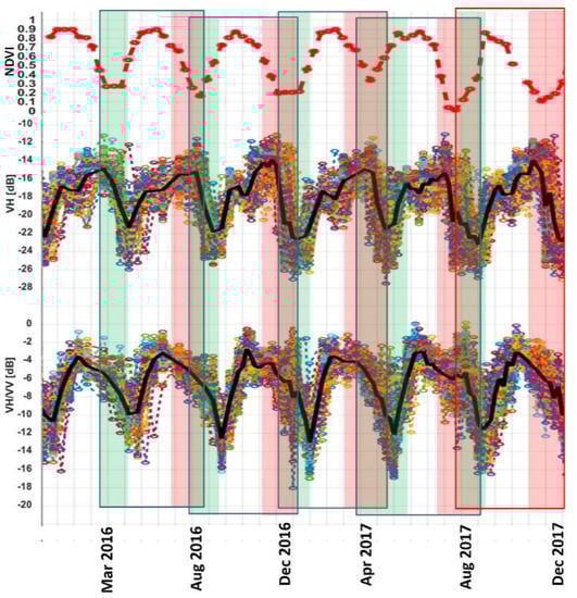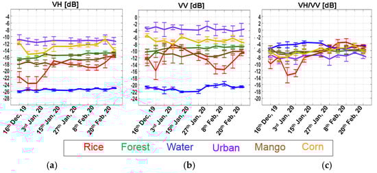 - The VH/VV ratio is also very variable with a 10 dB dynamic range in the season from −13 dB to −3 dB, while it is remarkably stable in the −3 dB to −6 dB range for the other LULC classes (Figure 11c).