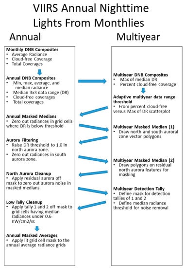 Flow chart for the data processing to make annual VIIRS nighttime lights from monthly cloud-free radiance averages.