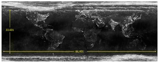 The process of assembling annual global nighttime light products begins with the establishment of a reference grid. We use a 15-arc second grid extending from 65 south to 75 north with 86,401 grid cells east to west and 33,601 grid cells north to south. The processing considers all the nightly VIIRS SNPP DNB data collected during a year, working in monthly increments (Figure 1). The monthly DNB cloud-free composites are generated by averaging the radiances from orbital segments that are free of sunlight, moonlight, and cloudy data based on the VIIRS cloud mask [2]. In addition to the average radiance, the V.1 monthly product set includes grids tallying the number of cloud-free observations and total number of observations. The V.1 monthly product sets are available at https://eogdata.mines.edu/download_dnb_composites.html (accessed on 30 December 2020).