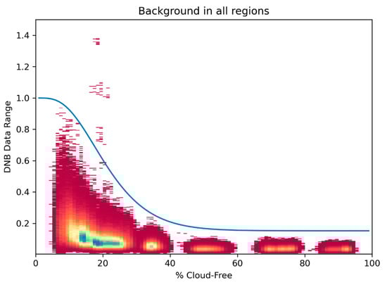 In the development of the V.2 VNL time series, particular attention was paid to applying the same DR threshold in each year of the series. This was accomplished by developing the DR threshold curve from a multiyear maximum median and percent cloud-free product spanning the entire set of years: 2012 to 2019. Sample sets of grid cells were extracted to cover a wide range of % cloud-free conditions (Figure 4), and a scattergram was prepared by plotting % cloud free versus DR (Figure 5). A gamma curve was fit to lie above the scattergram noise levels with tie points set at 0.2 at 100% cloud-free and 1.0 at 0% cloud-free. The DR threshold remained steady at 0.2 from 50% to 100% cloud-free and rose above the increased noise level present at lower % cloud-free levels. The DR threshold line was then used to create a global grid of DR thresholds from the multiyear percent cloud-cover product. This was then applied to each of the annual DR grids to identify and zero out background.