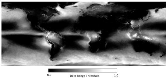 The multiyear DR threshold was calculated from the cloud-free coverages (Figure 4) based on the threshold curve (Figure 5) and is shown in Figure 6. The curve is based on a gamma function fit to yield 0.2 at 100% cloud free and 1.0 at 0% cloud free. The formula for the threshold curve as a function of PCT (% cloud-free) is as follows: