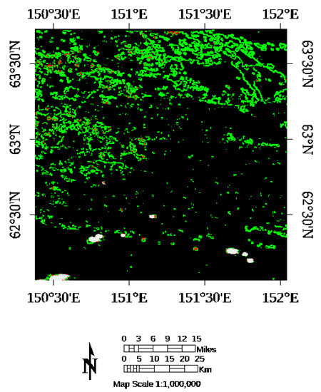 The image shows the tally of annual lit grid cell detections near 63 degrees north latitude following filtering based on the DR threshold. Grid cells with single detections are green and double detections are red. Most of the green areas represent noise leakage from imperfections in the stray light correction.