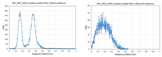 Both methods employ outlier removal to discard biomass burning pixels and isolate the background. In the V.1 method, the outlier removal is performed on histograms generated for each 15-arc second grid cell, with outliers clipped off from both the high and low radiance sides of the histogram. The discard of outlier pixels proceeds until the histogram’s standard deviation stabilizes. The new method uses the twelve-month median radiance to discard high and low radiance outliers, filtering out most fires and isolating the background.