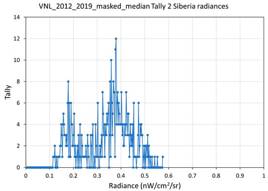 To address the remaining noise leaks, the detection numbers were tallied across all eight years. Noise leaks were found in African fire belts and in the far north, linked to imperfections in the stray light removal process (Figure 7). It was determined that the remaining noise leaks occurred only once or twice in eight years. Samples of the grid cells tallying 1 and 2 median radiances from two of the prominent noise areas were examined (Figure 8 and Figure 9) to set thresholds of 0.6 nW/cm2/sr, completing the noise removal.