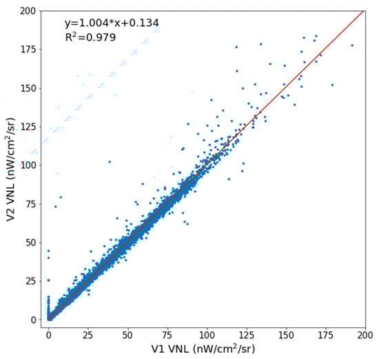 The V.2 and V.1 versions of the 2015 VNL were quantitatively compared and found to be highly correlated to each other for the vast majority of grid cells. However, it was found that the V.2 VNL had dim lighting detections in grid cells assigned to background in the V.1 VNL. Because of the different processing steps and thresholds, it is probably best not to mix the two product sets for multitemporal analysis. The V.2 product users can have confidence that all the processing steps and thresholds are the same across the entire series from 2012 through 2019. This is an advance over the V.1 methods, where a grid cell’s DR threshold could vary from year to year. This is an important distinction when it comes to making a superior product set for the analysis of lighting changes.