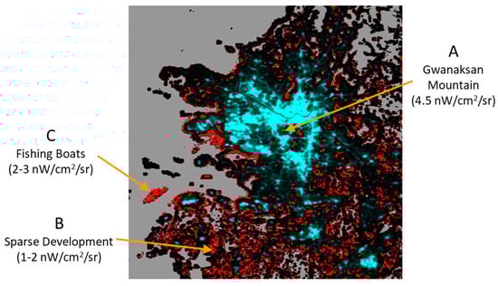 The next step is to examine the spatial distribution of the new lit grid cells, features present in only one of the two images. Figure 13 shows a color composite of the new lit grid cells as red and the old product as cyan for the Seoul region from Figure 11. The new lighting features present in the V.2 product include rims surrounding bright lights and areas of dim lighting missed in the V.1 2015 product. In effect, the detection limits of the V.2 product are lower than that of the V.1 2015 product.