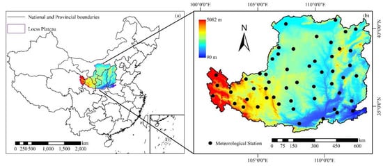 The location of the Loess Plateau including elevation and the distribution of meteorological stations.