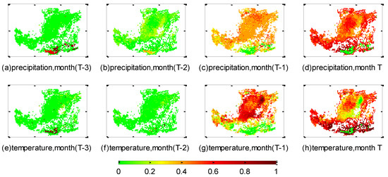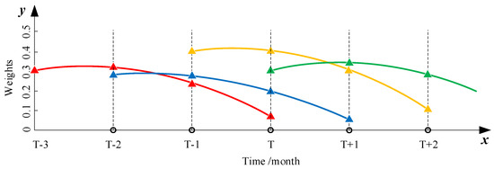Figure 3, as an example, demonstrates the consecutive variation of impact intensity of climate on vegetation [34], where the x-axis refers to the time (month), and T is the current month; the y-axis refers to impact weights of climate. Curves with different colors refer to the impact variation of the climate in a particular month, where the y-value at the intersection (triangles) of the curve and the dashed line of the different months are the impact weights of this climate factor on vegetation. The blue curve, for example, is the variation of the impact weights of a climate factor in (T − 2) month, and it is more influential in (T − 2) and (T − 1) and weaker in (T) and (T + 1).