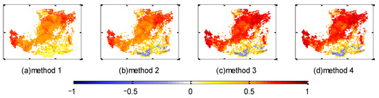 To evaluate the effects of precipitation and temperature on vegetation, we used linear regression for each climate factor of four methods. Figure 4 and Figure 5 are the correlation coefficients (r) of NDVI-precipitation and NDVI-temperature. The correlation between NDVI and climate factors is mainly positive, while there are some differences in the southern area in the Loess Plateau, which is mainly dominated by Cropland, which is determined by planting cycles and irrigation. Generally, climate factors and NDVI are less related in method 1, which does not consider the time lag, where those of precipitation and temperature are 0.51 (the average of the absolute correlation coefficients (|r|) of all pixels, the same below) and 0.67, respectively. The climate factors formulated by method 2, which consider the time lag to be a certain month, exhibit a higher |r| value with NDVI, 0.53, and 0.75, respectively. Method 3, which extends method 2 under considering consecutive months, enhances the |r| values to 0.61 and 0.78. Method 4 shows the best performance with the highest |r| value among the four methods, where the |r| values are 0.62 and 0.79. The results indicate that our method outperforms other methods, which show the highest correlation between climate factors and vegetation.