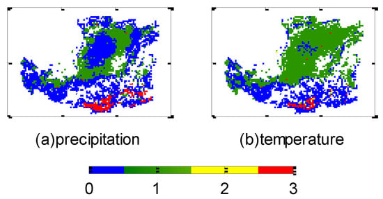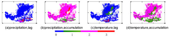 The negative r suggests in some areas of the south of the study region (Figure 4 and Figure 5), and the corresponding pixels show obvious differences in time lag from those with positive r (Figure 6, Figure 7 and Figure 8). Moreover, the statistic results of method 4, for example, show that the pixels with negative r are mainly located in Cropland since the ratios of the number of the pixels with negative r in each vegetation (Mixed Forest, Grassland, Cropland, Barren or Sparse Vegetation) to the whole are 7.94% (37 pixels), 0.00% (0 pixels), 28.39% (289 pixels) and 2.15% (2 pixels), respectively, in precipitation; 0.21% (1 pixel), 0.00% (0 pixels), 14.24% (145 pixels), and 0.00% (0 pixels) in temperature.