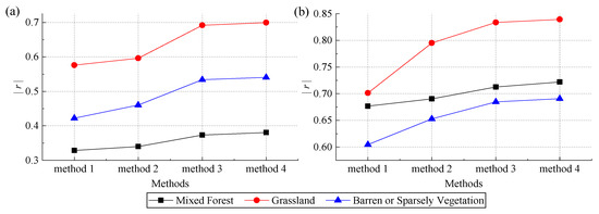 Descriptive statistics (Figure 9) are implemented to reveal the time-lag patterns of the four methods in each vegetation community, where the data are the arithmetic mean values of |r| in each method. Three results can be inferred from Figure 9: (1) The |r| values of Grassland with climate factors are the highest in different methods. (2) The |r| values of vegetation with its temperature are higher than those of its precipitation. (3) There is an increase in |r| values from methods 1 to 4.