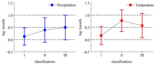 Average values of the lag patterns detected by method 4. (a) Precipitation; (b) temperature; I—Mixed Forest; II—Grassland; III—Barren or Sparse Vegetation.