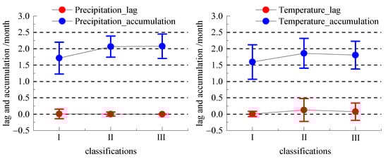 Average values (dot) and standard deviations (I-shaped lines) of the lag patterns detected by method 2. I—Mixed Forest; II—Grassland; III—Barren or Sparse Vegetation.