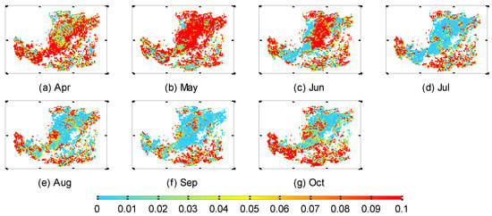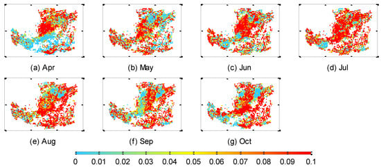Method 4 was used to analyze the correlation between NDVI and different climate factors in the monthly time series from 1982 to 2013 in the Loess Plateau. Figure 13 and Figure 14 show the significance level (p) of NDVI with precipitation and temperature in different months. The average value of precipitation in the significant areas during the growing season (April to October) was 53.31% (p < 0.05) and was greater than temperature, which averaged 39.75% (p < 0.05). There were obvious differences in significant areas with the same climate factor and different months. For example, the smallest number of significant pixels was for the impact of precipitation on NDVI in April and May, less than 40% (p < 0.05), while the number of significant pixels of impact on NDVI in July to September increased significantly, reaching more than 65% (p < 0.05). The number of significant pixels in which temperature had the smallest influence on NDVI in July and August were less than 35% (p < 0.05), and the largest in April and May, reaching more than 45% (p < 0.05).