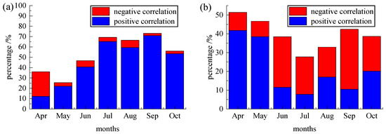 Percentage of significant pixels obtained by linear regression of NDVI and precipitation/temperature in different months. (a) precipitation; (b) temperature.