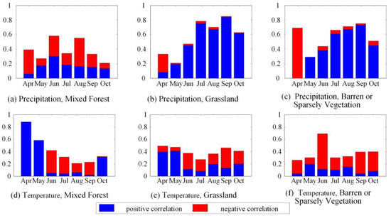 Figure 15 shows the proportions of significant pixels between NDVI and climate factors in different months. For different climate factors, positive correlation and negative correlation were different in different months. The influence of precipitation on NDVI in April was mainly negatively correlated, while the influence of NDVI in other months (May to October) was mainly positively correlated. The influence of temperature on NDVI was different from precipitation. Its influence on NDVI in April and May was mainly positively correlated and negatively correlated in other months (June to October).