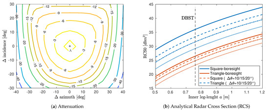 From Equation (4), the reflector’s RCS is aspect dependent, that is, varies with azimuth and elevation angle. The direction of peak RCS is in the bore-sight of a reflector, see Figure 1. Bore-sight of the trihedral reflector is in a direction that makes an angle of with any of its side plates. RCS diminishes away off the bore-sight. Attenuation, that is, the actual RCS loss due to azimuth or incidence misalignment—simulated for back-flipped square trihedral—is shown in Figure 2a. Simulation of analytical RCS values for the triangular and square trihedrals w.r.t. various inner-leg lengths is in Figure 2. It emphasizes the importance of the correct orientation of the reflector’s bore-sight towards the satellite’s line-of-sight (LOS) vector to utilize its maximum power response. While square trihedrals exhibit higher RCS at equivalent inner-leg lengths, the RCS loss due to their misalignment is more significant.