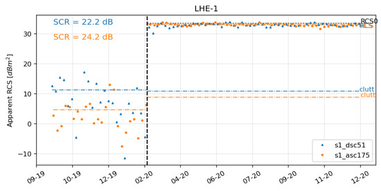 A corner reflector, that is, a point scatterer (PS), can be considered a deterministic signal determined by its physical properties and distance from the sensor, superimposed by the clutter, which introduces a circular Gaussian noise into the PS measurement [14]. Signal-to-clutter-ratio (SCR) is the ratio of the reflector’s signal power to the power of the surrounding clutter within the resolution cell [11,32]: