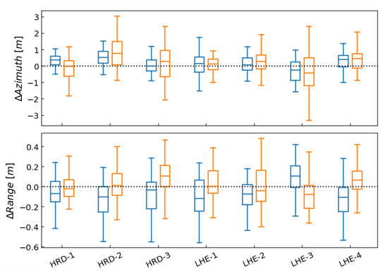 Reverse transformation of the reflector’s TRF coordinates to the radar coordinates is straightforward. Acquisition metadata (PRF, RSR, and ) and precise satellite orbit state vectors suffice for the closed solution of Equation (6). Comparing the reflector’s radar coordinates determined by the GNSS with the coordinates observed in the SAR images, significant differences can occur due to [9,10,33,34]: