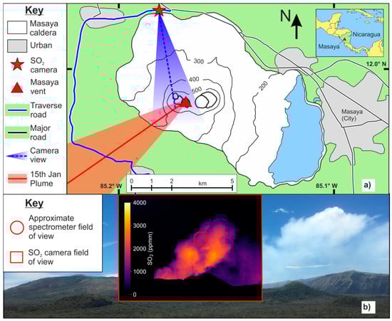 After [43]. (a) A map of Masaya volcano showing key measurement locations, the active vent and the approximate location of the gas plume. The inset shows the location of Masaya volcano within Nicaragua; (b) a photo of Masaya volcano showing the measurement conditions on the 15th January, captured at 11:27 local time, with the approximate field of view of the spectrometer (circle) and camera (red square) marked. The closest SO2 camera image for the time of the photo is shown in the field of view box.