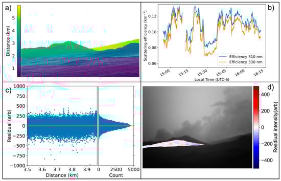 (a) Distances to the terrain from the camera calculated from NASA Shuttle Radar Topography Mission (SRTM) data. The distances to the triangulated mesh are rendered at their predicted position within the UV camera field of view. The setup shown is for the 13 January 2018; (b) the retrieved scattering efficiencies for the 310 and 330 nm camera for the whole of the 13th January; (c) the fitting residual of the 310 nm efficiency for the final camera frame, captured at 16:12 local time, as measured by the difference between the actual and predicted intensity of the edifice. A histogram shows the distribution of the residual; (d) the raw 310 nm image captured at 16:12 by the SO2 camera, showing the plume emitted by Masaya (greyscale). In red and blue are the residuals shown in (c) as plotted on the edifice.