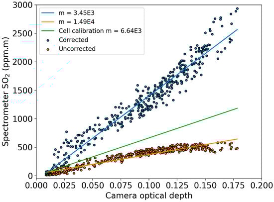 Calibrations for the conversion between uncorrected SO2 camera optical depth and SO2 slant column density (SCD) for the section of image a spectrometer is viewing, both corrected (blue) and uncorrected (orange) for light dilution, analyzed in the 306–316 nm wavelength window. The legend shows the gradient m from the best fit to the equation y = mx + c. Spectrometer data is from 15 January 2018 from 11:22 to 11:55 am local time. The calibration obtained from measuring SO2 gas cells is also shown (green).