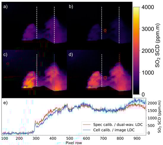 A single SO2 camera image captured on 15 January 2018 at 11:35 local time, as calibrated and corrected using the different methods. White, blue and red dashed lines show the plume speed correlation lines; (a) shows the results from using cell calibration without dilution correction; (b) is from calibrating the SO2 camera using an uncorrected spectrometer, with the correlated field of view of the spectrometer plotted as a red circle; (c) shows the SO2 image produced by correcting the optical depth images for light dilution then using the cell calibration; (d) is the image calibrated using a light dilution-corrected spectrometer, again with the correlated field of view shown. The correlation for this circle is separate to that of (b), producing the different sized circle. Note the change in SO2 distribution between the two corrected SO2 images; (e) the SO2 SCD found along the blue and red plume speed correlation lines in (c) and (d) are plotted for easy comparison of the plume distribution. These SCDs have been corrected for residual in the image optical depth.
