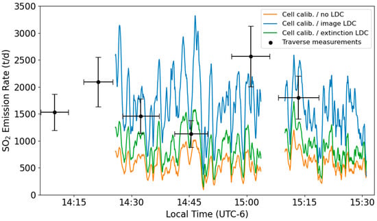 Uncorrected (orange), extinction (green) and image-based (blue) light dilution-corrected (LDC) SO2 emission rate from 13 January 2018 as measured by the SO2 camera, with using the cell calibration. Simultaneous traverse emission rates, shown in black, are plotted at the time measured at the center of mass of the traverse minus the travel time from SO2 camera measurement line to traverse road. The traverse error accounts for the duration of the traverse and the error in plume speed estimate from the camera.