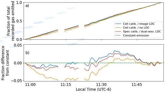 (a) The cumulative fraction of the total SO2 emission measured by each technique on the 15 January 2018 through each camera frame. Uncorrected (orange), cell-calibrated image-based corrected (blue) and spectrometer-calibrated dual-waveband corrected (red) techniques are presented. Additionally shown is a theoretical constant gas emission through time (green dashes). (b) The difference between the three techniques in (a) and the constant gas emission line.