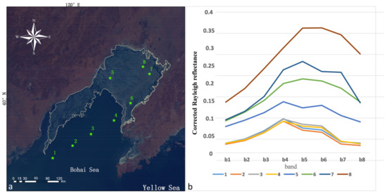 The spectral curves of Rayleigh-corrected reflectance. (a) The positions in LDB. (b) The Rayleigh-corrected reflectance. b1–b8 represent the 8 GOCI bands. The lines of different color correspond to the different positions in (a).