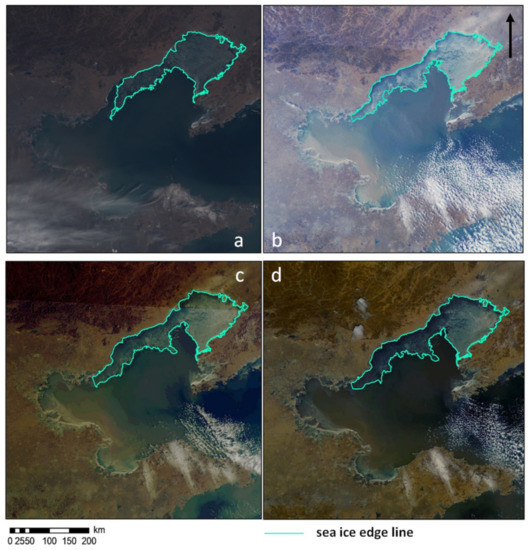 - Shi, W.; Wang, M. Sea ice properties in the Bohai Sea measured by MODIS-Aqua: 2. Study of sea ice seasonal and interannual variability. J. Mar. Syst. 2012, 95, 41–49. [Google Scholar] [CrossRef]