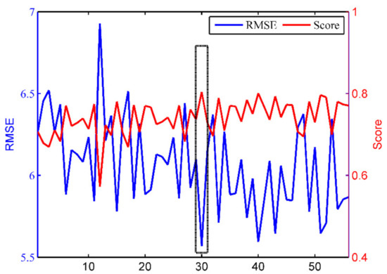 Accuracy analysis of the regression algorithms with combinations of 3 different bands. Three out of eight bands were selected, and there were 56 combinations. The blue line represents the root mean square error (RMSE) between the regression results of the 3-band combinations and two oil platform observations. The red line represents the skill score of the 3-band combinations. The black box encloses the minimum RMSE and maximum skill score.