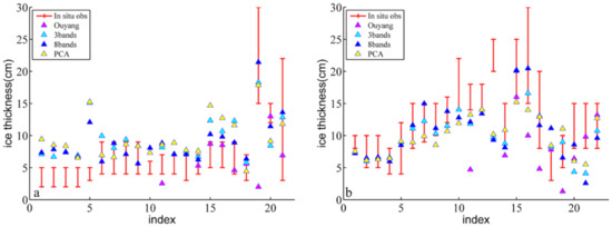 The results of different SIT retrieval methods for (a) JZ9-3 and (b) JZ20-2. The red lines represent the observed SIT ranges. The magenta triangles indicate the SIT results obtained with Ouyang’s retrieval method [29]. The deep blue triangles indicate our results obtained with the 8-band combination method. The light blue triangles indicate the SIT results obtained with the 3-band combination method. The yellow triangles indicate the SIT results obtained with the PCA retrieval method. The index of the horizontal axis refers to the date in Table 2.