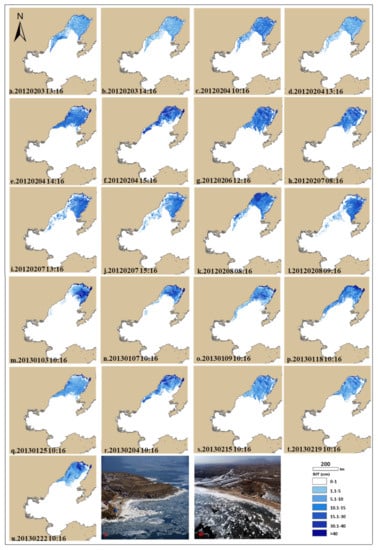 The SIT during 2012 and 2013 was retrieved by multiple linear regression (Equation (5)). Its distribution is mapped in Figure 6. The SIT is largest in the northeast part of LDB, especially in the region close to the northern shoreline, and it is consistent with the photos from Figure 6v,w. The sea ice becomes increasingly thin from north to south, and the same trend appears on the southwestern “tail”. In the east-west dimension, the SIT in the bay near the west and east coasts is small relative to that elsewhere, with the largest SIT usually occurring in the middle of the bay. This phenomenon can be described as follows: thicker ice is always situated between the two “corners” of the region of Liaoning Province.
