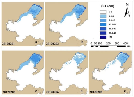 Sea ice plays crucial roles in the earth’s climate system and ecosystems [1,2,3,4,5], although it covers only approximately 7% of the global ocean [6]. It has a paramount position in thermodynamics by modulating sea ice ablation and accretion processes [7]. In addition, it can affect the vertical distribution of marine hydrological elements and the movement of sea water. However, once a sea ice disaster occurs, a series of problems for offshore operations, ship navigation, port transportation, and marine fisheries follow [5,7,8]. The Shengli and Liaohe oil fields distributed in Liaodong Bay (LDB) and the oil and gas drilling platforms in this region often suffer much damage due to sea ice disasters [9]. For example, the heavy sea ice disaster in LDB in 2010 led to an economic loss of approximately 292 million dollars [8,10]. Since the severe ice cover event in the Bohai Sea in 1969, more attention has been given to monitoring and investigating sea ice to provide scientific support for the prevention and mitigation of sea ice disasters. Therefore, research on the sea ice of the Bohai Sea is required.