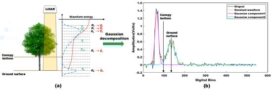 The third step is to extract the canopy bottom and ground positions. The decomposed Gaussian components represent the detected objects at different height levels. For forest measurements, the last decomposed component was generally considered to correspond to the ground surface, and the remaining components were canopy returns [,]. Therefore, we took the position of the last peak as the ground surface and took the end position of the last component of the canopy as the bottom of the canopy (Figure 3).