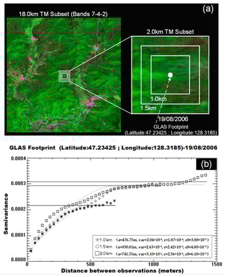 (a) Shortwave bidirectional reflectance factor (BRF) composites (Landsat-TM 7-4-2 band) centered on a GLAS footprint (lat: 47.23425; lon: 128.3185) in Heilongjiang, China, at ground level. Trees are indicated by the shades of green, bare areas are shown in pale-pink, and water is black. (b) Variogram estimators (points), spherical model (dotted curves), and sample variance (solid straight lines) obtained over this GLAS footprint using surface reflectance derived from the TM scene on 19 August 2006 with spatial thresholds of 1 km, 1.5 km and 2.0 km as a function of distance from the center of the GLAS observation.